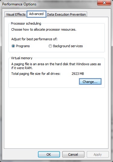 4. Select “Advanced” tab and click on “Change” under “Virtual Memory”.